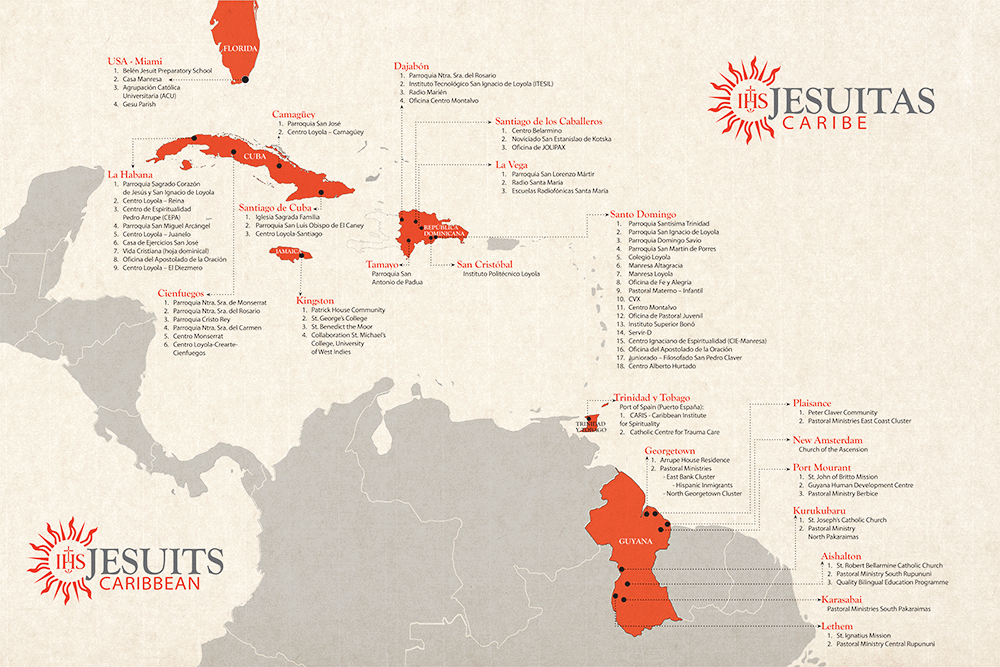 Estamos presentes en distintos países del Caribe, Cuba, República Dominicana, Jamaica, Guyana, Miami y Trinidad y Tobago, acompañando comunidades a través de obras educativas, pastorales, sociales, espirituales y de comunicación. Desde esta presencia, buscamos discernir y responder con creatividad y compromiso a los desafíos de la región.